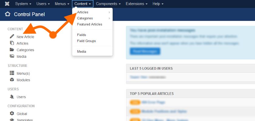 Εσείς μπορείτε να επιλέξετε μία από τις δύο επιλογές που σας δίνετε είτε από το αριστερό Menu είτε από το πάνω οριζόντιο… Content / Articles / Add New Article…