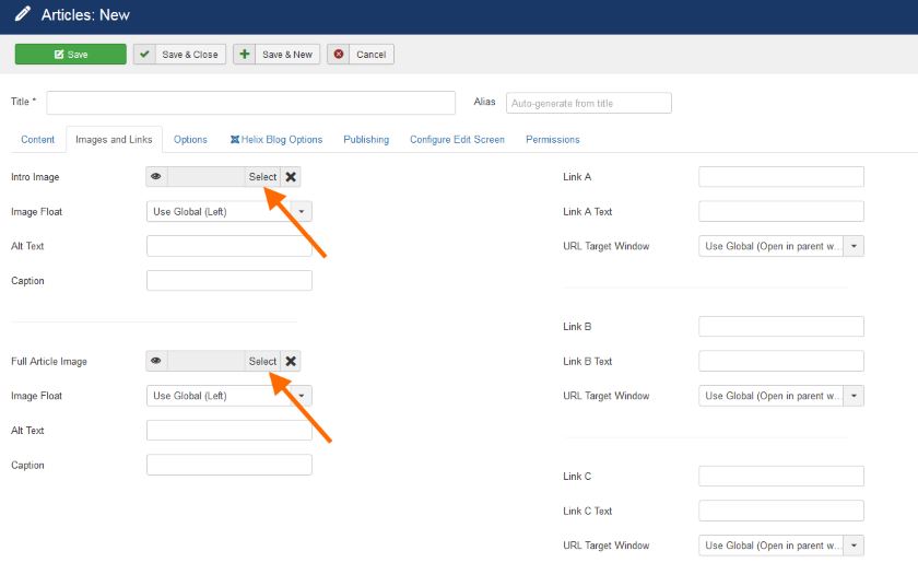 Πατήστε στην καρτέλα Images & Links και στη συνέχεια επιλέξτε το πεδίο Intro Image (ανεβάστε την έτοιμη εικόνα σας σε ένα φάκελο και επιλέξτε την) και στο Full Article Image απλά επιλέξτε την ήδη εικόνα που είχατε ανεβάσει πριν