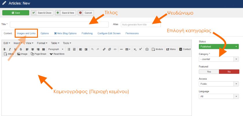 ΠΡΟΣΟΧΗ: Το πράσινο κουμπί Save, αποθηκεύει το άρθρο χωρίς να φύγετε από την επεξεργασία του άρθρου. Εφόσον έχετε τελειώσει το άρθρο, μπορείτε να φύγετε από την επεξεργασία πατώντας το κουμπί Save & Close.